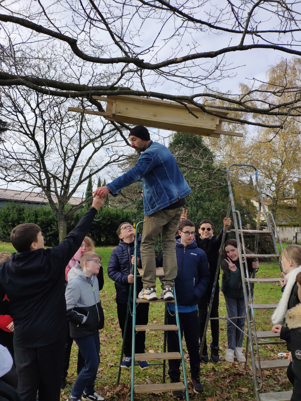 Son intervention s'est déroulée à l'extérieur, dans un premier temps. Il a fallu trouver l'endroit idéal pour installer le nichoir à chouette chevêche, construit par les élèves de la Segpa en juin dernier.