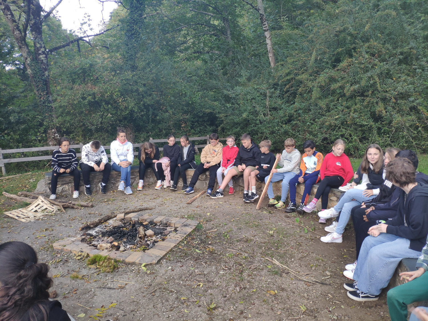L’après midi a commencé par une promenade sur le plateau de Contrast, promenade digestive mais aussi éducative puisque les élèves ont appris comment fabriquer un pétard avec une feuille de noisetier, comment imiter le chant d’un oiseau en plaçant une feuille entre leur main et en soufflant dessus. Ils ont pu aussi remarquer une anomalie : l’apparition de jeunes pousses sur les arbres, signe du dérèglement climatique.
